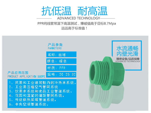 □  管件連接牢固:由于聚丙烯具有良好的熱熔接性能,熱熔連接將同種材料制造的管材和管件連接成為一個(gè)整體,杜絕了漏水的隱患。